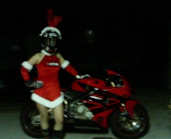2006 ははははは!!!の大馬鹿!!! ガレージにサンタがやって来ました!! 何でも、疲れたから一服させてくれとのこと。 もちろん、了解したが・・・その出で立ちは凄い。 フルフェイスにレーシンググローブ&ブーツ・・・ 結構サンタ業も大変らしい。 最近の餓鬼・・・いやお子様達はお願いする物が高額で、 なのにサンタ業界も不景気だから、ボーナス半カットでもう・・・ と泣いておりました。 でも、そのプレゼントの袋を持ってらっしゃらないので聞くと、 『ああ、うん。実はさ足がCBRじゃん?袋持ちながら運転できないから、 シート下に積めるだけしか持ってこなかった!』 そうですか・・・車検証と小物程度しか入らないシート下にねぇ。 しばらくして、サンタは笑顔で 『いっちょぅ行ってくらぁ!!』とこの寒さの中、 あんな格好で颯爽とCBRに跨り去って行きました。 いい子に寝ていれば、きっとサンタさんがプレゼントを持って・・・ 爆音で目覚めちゃうかもねぇ~(-▽-;) ブォンブォン!! ※写真の人物は誰かって?!誰でしょう? 苦情等は受け付けませんので、よろしくお願い致します。(--) お付き合い頂き、ありがとうございました~♪