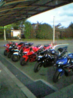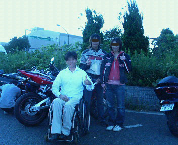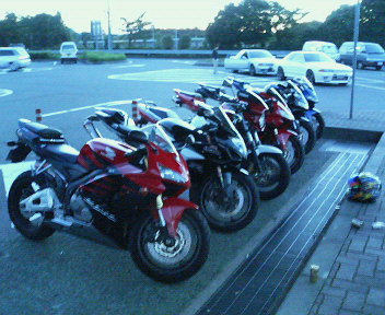 喜びを体で表現・・・言葉で示し会話を弾ませていた。 都筑Pも結構、車(いじった)やバイクが入ってくる。 するとバイク4台がジョー達の止めているところにやってきた。 CBR600RR・GSXR1000・バルカンクラシック1500(多分)・エリミネーター250 なんとなく挨拶して会話がはじまる。 CBR600RRは逆車で、CBR談議に華を咲かせた。 エリミネーターのオーナーは、なんと!17歳の女子高生☆はい!食いついた! すごいなぁ・・・ジョーが高校生の時はバイクに乗ろうなんて考えもしなかったけど。 かっこ良いっす(^v^) バルカンクラシック1500とエリミネーター250の2人は先に帰り、 6人でおしゃべりが続く。 話の内容は、始めバイクだったのだが、何故かお相撲さんの話しへと変わり、 しまいにゃ、『えなりかずきのものまね』に発展(?)していった。 みんなでえなりのものまねをする。 なんの集団なんだろうか・・・? 右からワッテさん・旦那様・ジョー・さーやん・GSXR1000さん・CBR600RR(逆)さん すると東の空が真っ赤に染まり始める。 え?!もう朝?みたいな感じで、楽しいと時間が分からなくなってしまう。 彼等は週末に、お台場の大江戸温泉裏の公園によく集まると聞き、 今度の週末行く事にした(^^) 2人とはそこで解散し、我々も帰ることにした。 ワッテさんも途中まで一緒なので、みんなで下道で帰った。 朝のしかもオールあけの日差しは眩しく、 厚着していたせいもあって、暑かった・・・(−。−;) 環七途中でワッテさんと別れ、ガレージへと向かった。 午後にはライコランドへ行くので、少しでも仮眠をとりたい。 体力の限界を迎えていたジョーには、ガレージも立派な寝室となる。 ダンボールを敷き、寝ていた旦那様をどかし寝床を奪い取る。 3時間ほどぐっすり寝た。 睡眠時間は少ないが、何故だか目ざまは良好で自宅に戻る。 ツネさんが来ているであろう、ライコランドに早速向かった。 ツネさんとは初の顔合わせである。 すー爺さんから色々話は聞いていたが、 やっぱりドキドキ・ワクワクするなぁ(・v・) つづく 会社でブログ更新を試みるチャレンジャー(常習犯)ジョーです!