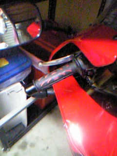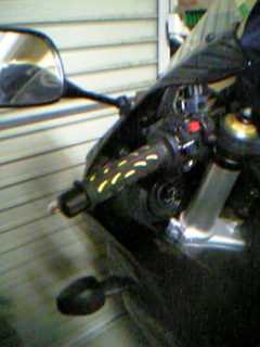 予定通り雨でしたので、浸水ワーゲンで行った。 お目当てはグリップと、ホイールステッカー。 以前は売り切れで手ぶらで帰ったリベンジである。 CBRコーナーに一目散に向かったが、やっぱり売り切れ。 ならば!と思い、グリップコーナーにも向かったがやっぱり無い。 がっくり肩を落とし、バーエンド変更に切り替えようかと思っていたら、 近くに店員さんが・・・ ダメもとで、目当てのグリップの話をしてみた。 『ああ!有りますよ。これですよね?』 そう軽快に答えて差し出した手には、 ジョーが散々探し続けたそれがあった。 『あ~やった!これです!!』 とまるで子供のようにはしゃいでしまった。 店員さんも良かったねぇ~と言わんばかりの笑顔で渡してくれた。 後からあのはしゃぎように恥ずかしさを覚えた・・・ 小学生の頃、ファミコンのカセットをようやく手に入れた あの時の感覚にかなり近かったように思う。 ジョーは赤を、旦那様は黄色を購入。 ほくほく顔で帰った。 早速取り付け開始。 5分ほどで2台とも交換完了! うう~ん良いねぇ♪ にぎった感覚はジョーはあまり変わった感は感じなかったケド、 かなり見た目はカッコ良くなったじゃ~ん!!(>▽<) でも旦那様の黄色もかなり目立ってイイ感じ! 逆車は真っ黒だから(スイングアームまで黒)かえってインパクトになる。 お互いにニマニマしながら一服して、 今週こそは乗ることを決意したのだった。 多少の雨でも練習しなくちゃね。 ツーリング中は天候が変わったからって、乗らない訳にはいかないもの。 余談ですが、以前ジョーの納車の時に付き合ってくれた後輩が、 ようやくもうすぐ卒検です。(懐かしい響きだ・・・) FZ400を購入予定です。 買ったらツーリングに一緒に行く予定です♪ ここに写真を載せる日も近いのか・・・