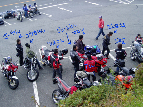 あんまり日にちが経つと、忘れてしまうのでレポート提出(?)する。 ※書き直す・書き足す予定ありのレポートざんす。 箱根ツーリングレポート 東名高速 海老名SA am7:30全員集合完了。 朝の海老名はもうすでにたくさんの車やバイクでいっぱい。 実は、ジョーは海老名SA集合が夢だった・・・(−▽−) この時点で80%満たされる。 早速恒例のコーヒーじゃんけん!! 今回は9名なので、負けると¥1,080(自分含む)の損害★ 公式ルールにのっとり(あるのか?!)多いからといってグループに分けるなどしない。 あくまで全員でいっぺんにじゃんけんなのである。 初めの犠牲者:マロン!! いきなりの出費である。 大まかなルートを決める。 西湘バイパスは遠回りなので、やはり小田原厚木道路で行くことにする。 だんだん車も多くなってきた。 休憩無しでいっきにターンパイクまで行く。 ターンパイクは、結構大きい道路で走りやすかった。 車では走ったことはあったが、バイクでは初めてで、どんな感じで走ったら良いのか分からず、 フラフラしていた(^^;)すー爺さんにコーナーのライン取りを聞いていたので、 試してみるといい感じに走れた。 am9:30 大観山Pで休憩。 コウちゃんが途中でガス欠になってしまい、上ってくるのに大変だったらしい。 ジョーは先に上って来てしまったので、全然知らなかった・・・ ここでもやります!コーヒーじゃんけん!! 公式ルールにのっとり(もうつっこまない)一度負けても参加する。 じゃんけんの世界は厳しいのである(−v−) (?) 第2回目の犠牲者:ワッテさん!! 早速買いに行ってビックリ!!! もちろん全額ゴチです。¥1,350の損害★ ここで、大量に休憩する。 沢山のバイクや外車が来ていて、色々見物する。 とそこへCBR1000RRに乗った女性が来た。(しかもつなぎ姿!) 一同『おお!』 気さくに話しかけてくれたその女性は、もともとCBR600(RRの前)乗りで、 最近1000RRに乗り換えたらしい。 椿ラインを通って大観山Pまで来たと言う。凄いなぁ・・・ 『途中で他の1000RRが事故してた』と言っていた。攻めるようなコース(?)なのだろうか。 予定から外して正解だったかも・・・(^0^;) ここでTさんの提案で山中湖方面を目指すか!とういう案がでる。 とりあえず給油が第一だったので、芦ノ湖周辺まで下ることにする。 1000RRの方とお別れをして、出発! GSに着いて、みんな給油することにした。 ハイオク1L¥150・・・高い(。。;) GSを出るとき段差でジョーはエンストしたが、ここは気合いでコケは免れる・・・ふぅ 芦ノ湖スカイラインへと進んでいった。 芦ノ湖スカイラインは、これまたもっと大きな道路で景色良い。 途中、芦ノ湖スカイラインと箱根スカイラインの分岐で一旦止まる。 と言うのも、Tさん・ジョージさん・旦那様の3人が『もう一周してくる!』というのである。 他の参加者はいなかったので、他のメンバーはここで休憩。 景色は山々ばかり・・・芦ノ湖ほとんど拝めず必死でここまで来ちゃったなぁ しばらくするとTさん到着!バトルの決着は付いたようだ。 遅れて帰ってきたジョージさんと旦那様は・・・ 『俺等は紳士だから、あんな運転はしないんですよね』 と訳の分からない負け惜しみを吐いていた。(−−)危ないなぁ そこからとりあえず昼食を取るために、御殿場まで行くことにする。 箱根スカイラインは、芦ノ湖スカイラインのように大きな道路だったのだが、短い。 そこからは乙女峠を抜けて御殿場へ出るのだが・・・ この乙女峠がきつかった・・・ 早い人たちは先に行き、ジョーから後ろはジョーのせいで渋滞になった。 もうどうしたら良いのか分からない。 すー爺さんから聞いていたライン取りはスッポリ抜けてしまい、 次々と来るコーナーをこなすことしか頭に無い。 下りの右コーナーが苦手と判明。 他のメンバーの話だと、 さーやん:抜かそうか迷ったけどジョーさん怖がっていたし、抜けなかった。 マロン:リアタイヤが滑って怖かった。(1300という大排気量)何よりコウちゃんが心配だった。 コウちゃん:みんなと同じように進入しても曲がれないから怖かった。(ロンスイのせいか) 御殿場で昼食を取る。 pm12:30 お食事処到着!!(店の名前?・・・知らん!!) ここでようやく集合写真を撮る。かっこいい〜(>▽<) さぁ丼飯食うだ〜♪ お腹が満たされると、疲労と睡魔が襲ってくる。 ということで、ここでツーリングは『帰宅』という選択肢で収まった。 帰りはすぐ御殿場から東名に乗った。 Tさんにジョーが『こいこい』とされたので、思い切って付いて行ってみる。 が、数分も経たない内に見えなくなってしまった・・・(・・;)おーい・・・ pm15:30 最終休憩場所 海老名SA さぁ!最後のコーヒーじゃんけんですぞな〜 ん〜やっぱりコーヒーじゃんけんと言えばこの方でしょう・・・ 今回は期待を裏切りませんでした!! 3回目の犠牲者:さーやん!! 何故かすがすがしいさーやんがそこにいた。 きっと役目をきっちり果たした達成感(?)からだろう・・・(=v=) コーヒーを飲みながら談笑している